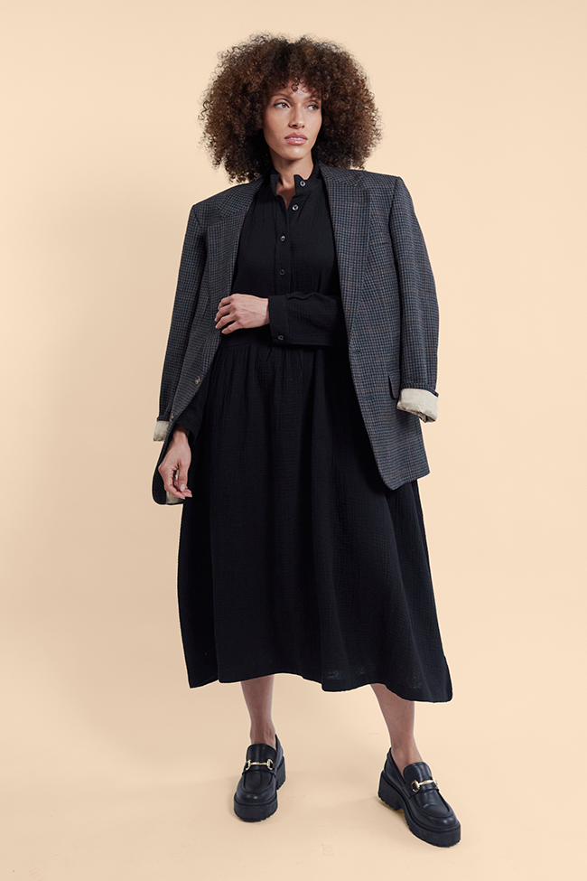The same great oversized silhouette in the body and sleeves as our best-selling Sleep Shirts, but we've added a full length, gathered skirt and pockets for a new longer Sleep Dress that you'll reach for again and again. The Double Gauze fabrics have been extremely popular since we first offered them in Resort 2020, so this black version became a quick favourite. This lightweight, pillowy fabric can be described as "feeling like you are wearing a duvet."