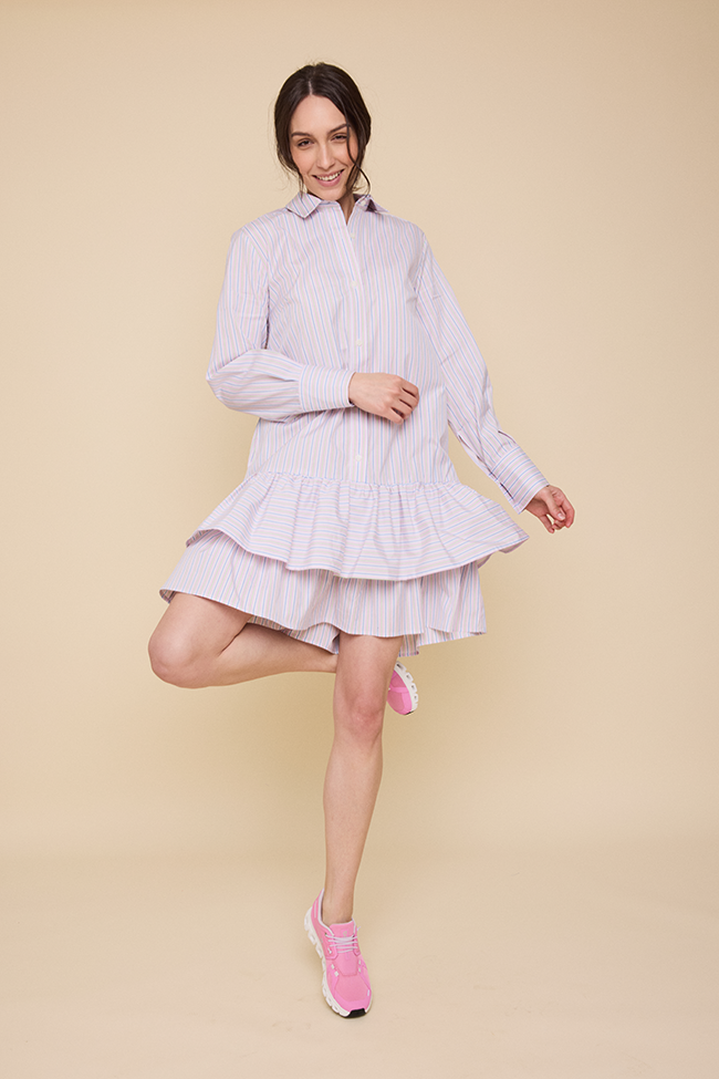 This is a flirty shirt dress with a playful double ruffle hem that adds just the right amount of movement. Designed with a classic button-down front, it's made to be versatile. Wear it as an easy day dress, a breezy beach coverup, or as a nightie. The double ruffle detail brings a soft, feminine touch, making it perfect for twirling through the day. A cheerful spring striped fabric, featuring pastel multi-colored stripes on a crisp white base, bringing a playful energy to any wardrobe.