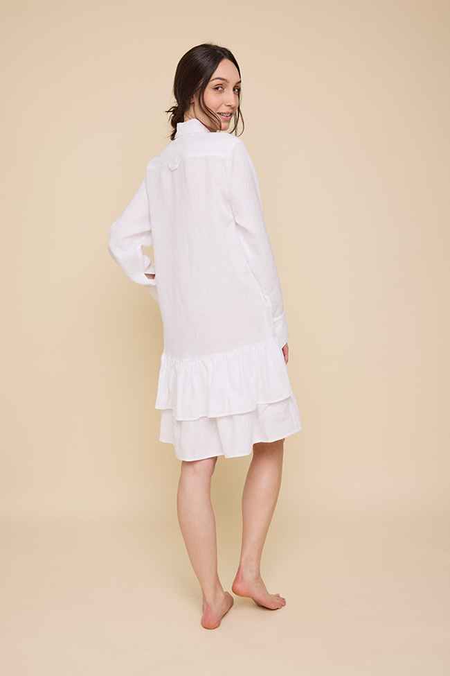 This is a flirty shirt dress with a playful double ruffle hem that adds just the right amount of movement. Designed with a classic button-down front, it's made to be versatile. Wear it as an easy day dress, a breezy beach coverup, or as a nightie. The double ruffle detail brings a soft, feminine touch, making it perfect for twirling through the day. The linen is a medium weight, it isn't too heavy but it does feel a bit crispy at first. Once you've washed it a few times you'll find the fabric softens and feels great.